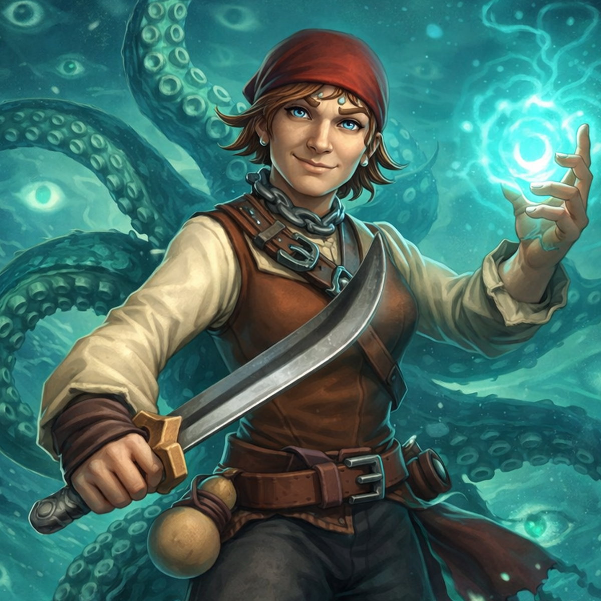 Disgraced privateer turned pirate, Morgan Crow, sailed the seas with the crew of the Mad Dragon for years. This was until the quartermaster pinned missing loot on her, and the captain sent her to find the bottom of the ocean with a ball and chain to help. As salt filled her lungs, they showed themselves. Hundreds of spectral eyes blinking out of sync as a dozen different voices offered a second chance at life in exchange for bringing them beyond the waves they’re bound to. Now with a new name and an eldritch force known only as The Audience at her back, Morgan Deep travels with a ragtag group of adventures she’s grown to call friends.